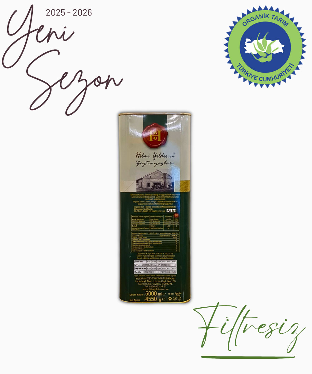 Hilmi Yıldırım Organik Erken Hasat, Filtresiz, Soğuk Sıkım Natürel Sızma Zeytinyağı 5 L